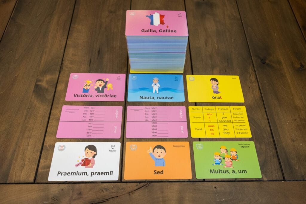 These flashcards feature a picture on the front for word recognition. On the back, the card is pre-filled up to the point where the endings are meant to be written in by you or your child. This format helps students see the endings and effectively memorize them. Having these fill-in flashcards will be a vital part of learning the Latin puzzle pieces. Each deck comes with 266 cards